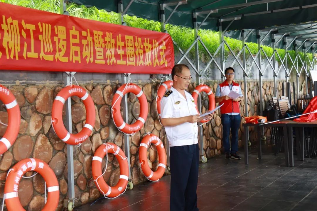 柳州海事局政委李伟刚致辞,他提到在柳江投放救生圈是一项公益文明活动,一方面能最大限度发挥救生圈的基础使用功能,提高市区柳江河段跳桥、溺水等水上突发险情的处置成功率,另一方面有利于完善公共场所的基础服务设施,提升城市服务形象。