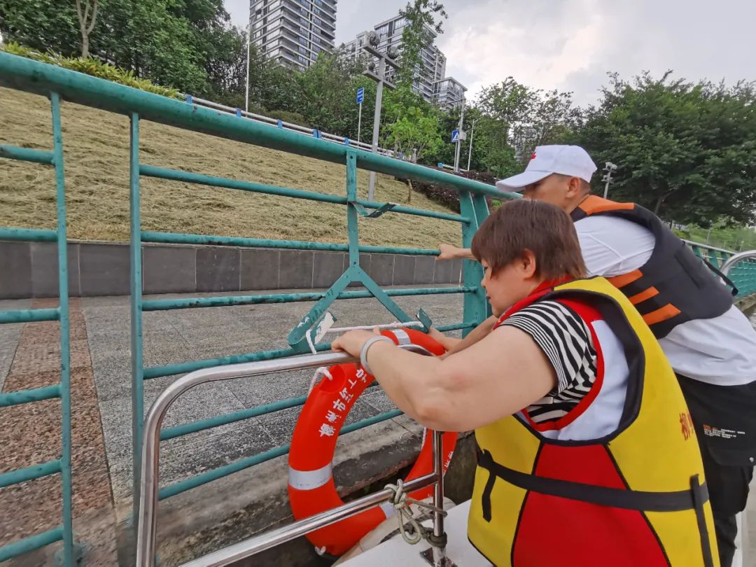 ▲市红十字会党组书记、常务副会长袁燕珍同志沿江投放救生圈