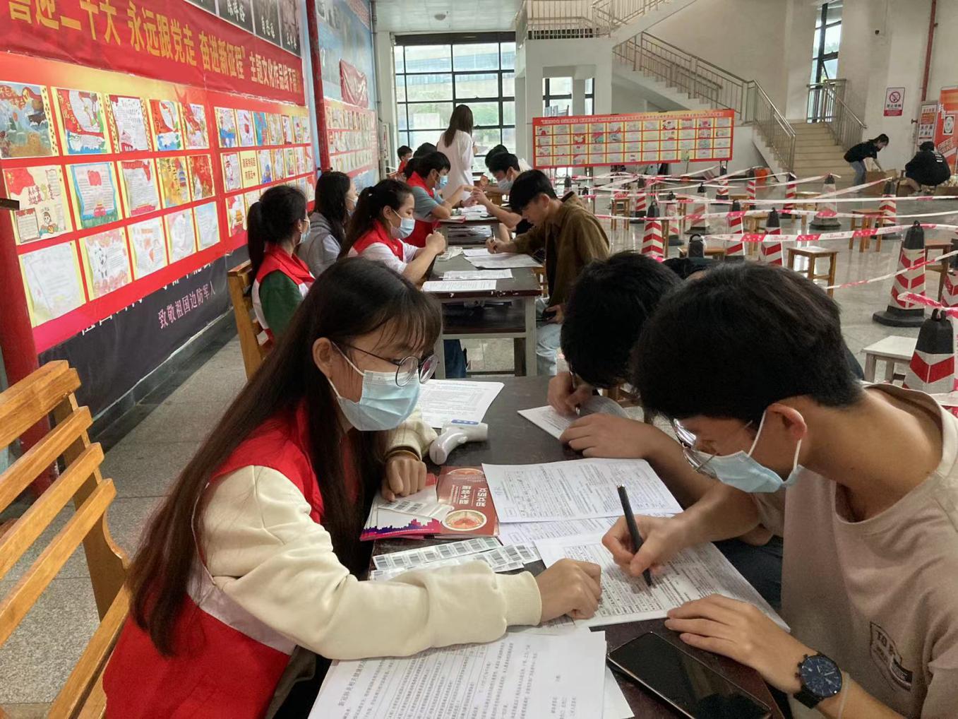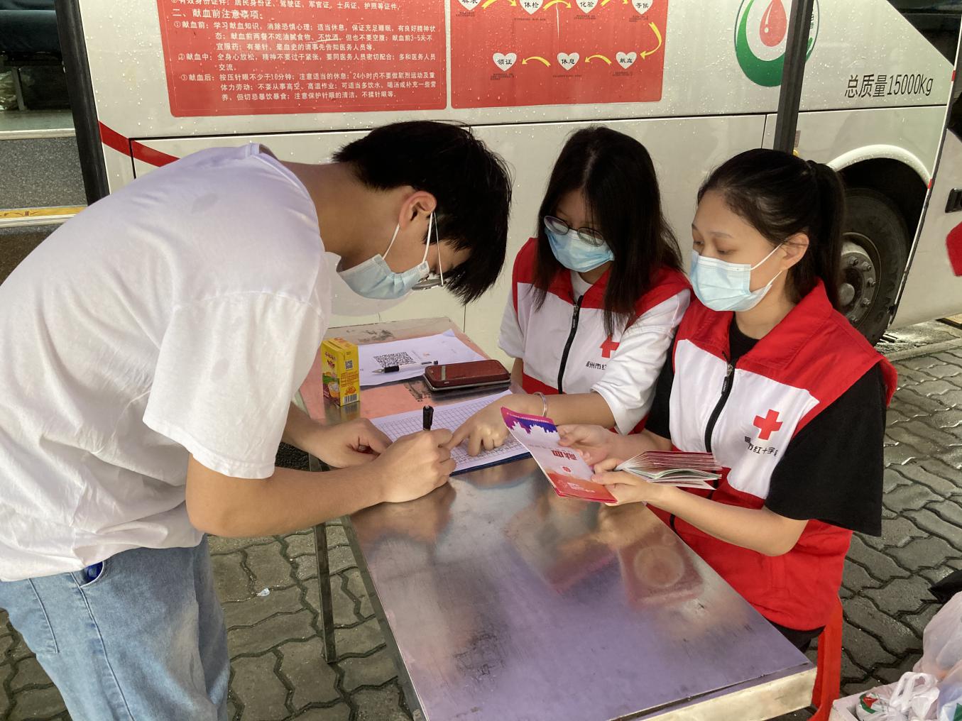 ▲志愿者们为献血学生发放宣传折页、指导他们进行填表