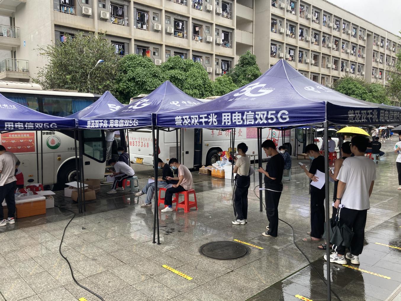虽是阴雨绵绵,但接到无偿献血活动的通知后,校大学生红十字志愿服务队的队员们主动担当,在大雨中做好志愿服务工作,为前来献血的同学发放宣传折页、讲解献血知识,同时耐心指导他们进行填表,为正在献血的同学倒水,贴心做好服务工作。“今天来献血的同学们都很热情,从早上到现在,三架献血车一直排着长队。”校大学生红十字志愿服务队负责人说道。