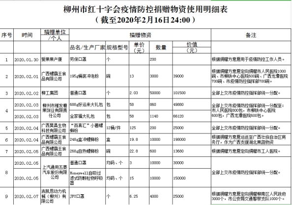 | 399 | 2020.02.13 | 柳江县鑫煌木业有限公司 | 20000.00 | 转账捐款 | |