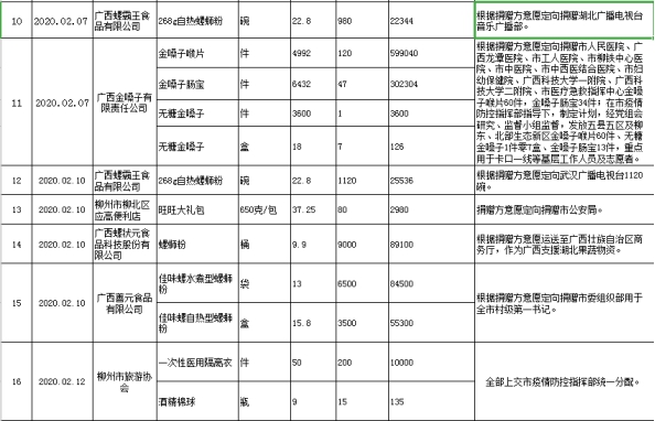 | 365 | 2020.02.11 | 柳州雅乐食品有限责任公司 | 3000.00 | 转账捐款 | |