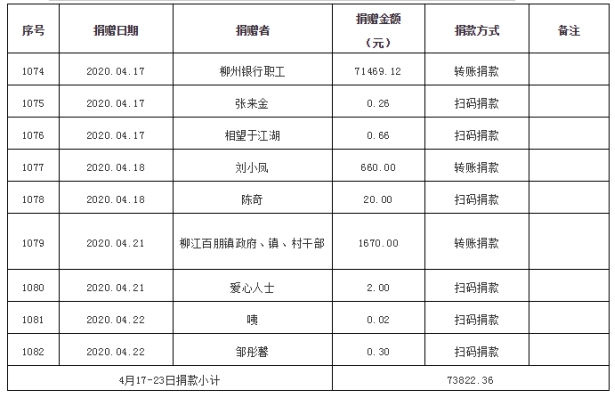 一、自2020年4月17日0时至4月23日24时收到捐款73822.36元,明细如下: